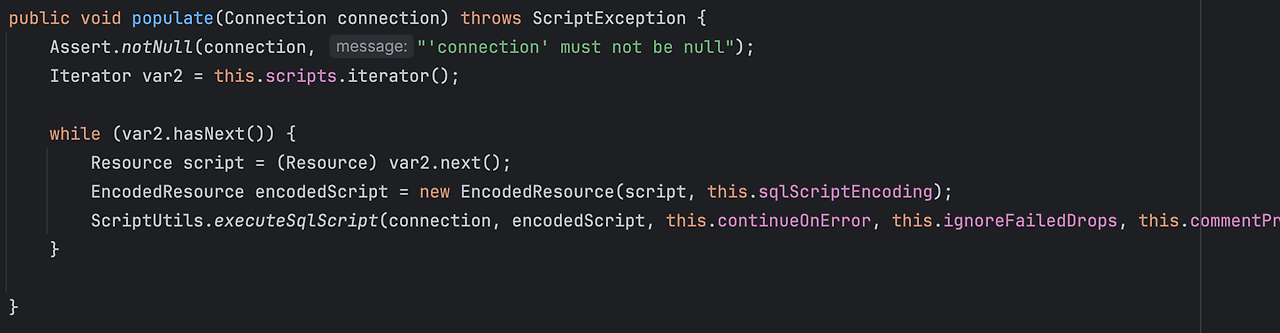 바로 아래에서 살펴볼 예정이지만 살짝 설명하자면 populate()는 script를 실행시켜 DB에 쿼리를 날리는 메서드이다.