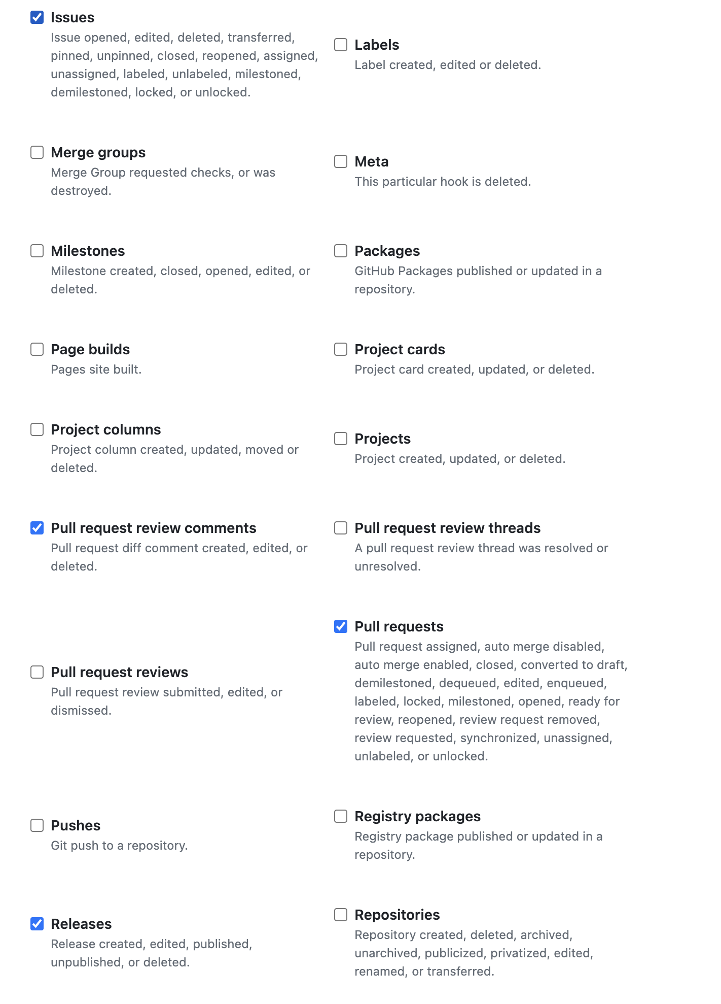 때문에 세 번째를 선택했고, Issue, PR, Release, PR에 리뷰가 달렸을 때 를 알림이 필요한 정보라고 생각해서 받도록 설정해주었다.