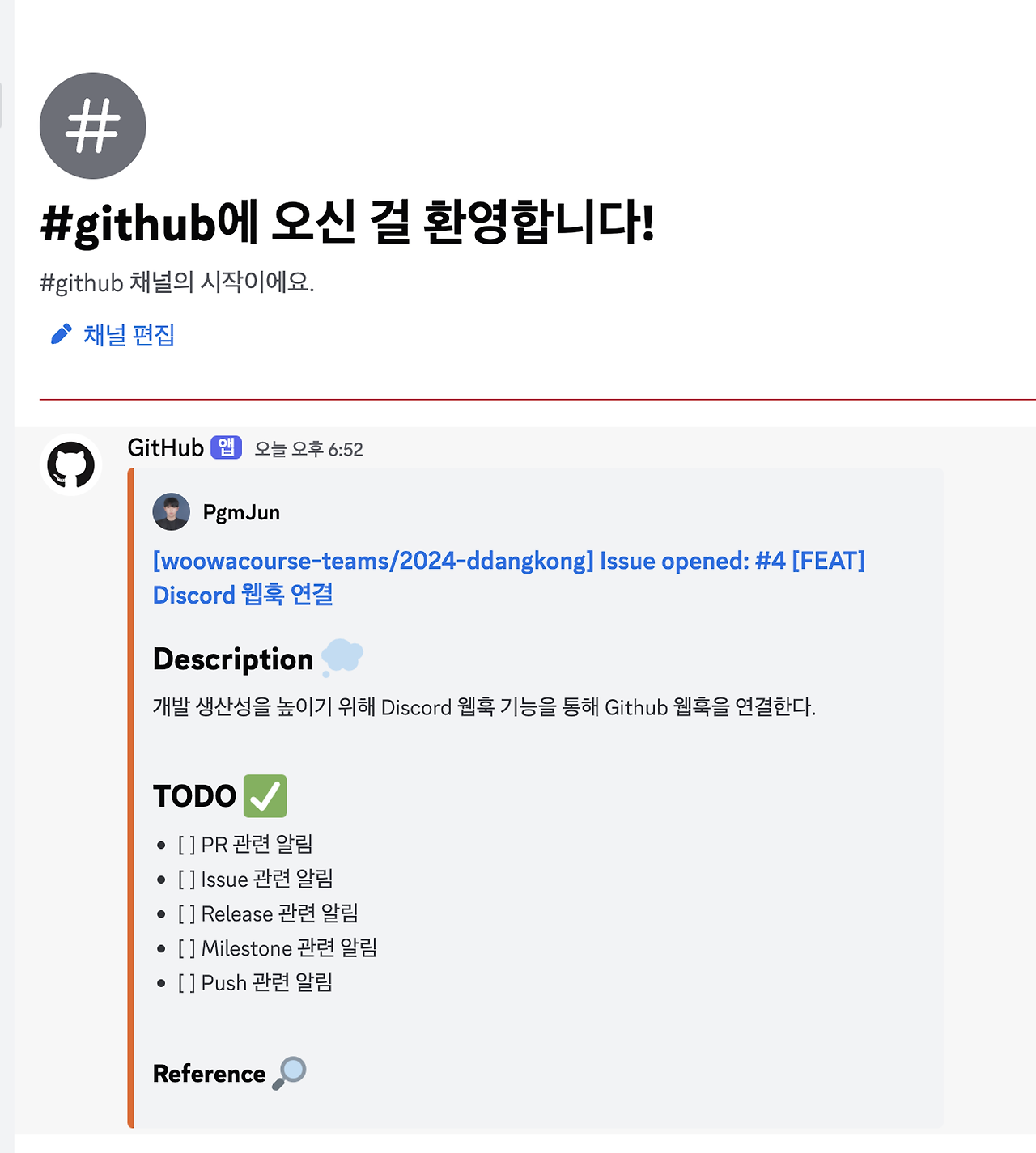 Discord 채널에 Webhook을 연결하여 Github 내에서의 Issue 생성, PR 생성 등 특정 행위가 발생하면 알림을 보내도록 설정할 수 있었다.