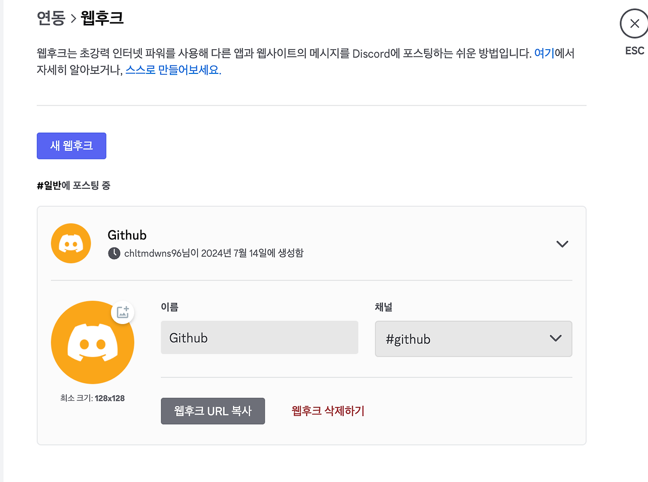 나는 방금 알림을 위해 만든 github 채널을 선택했다.