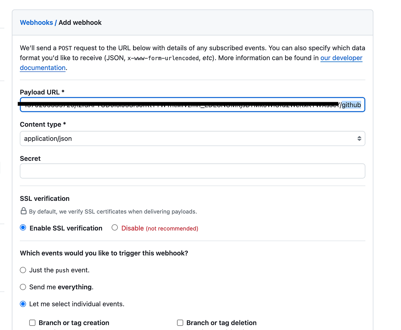 - ‘Payload URL’에 Discord에서 복사해온 웹후크 URL + /github 입력