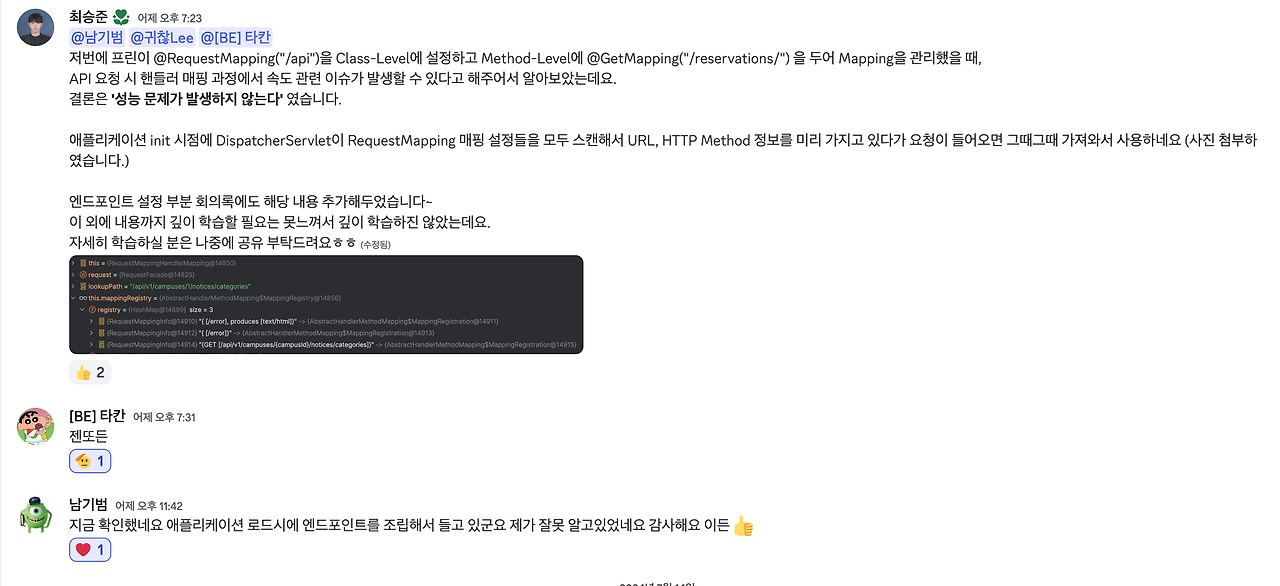 직접 RequestMappingHandlerMapping 로직을 뜯어보고 그 결과를 팀원들에게 공유해주었다.