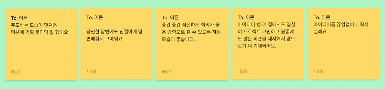 이러한 노력을 알아주었는지, 스프린트 회고 시간에 팀원들로부터 주도적으로 행동한 부분에 대해 긍정적인 피드백들을 받을 수 있었다.