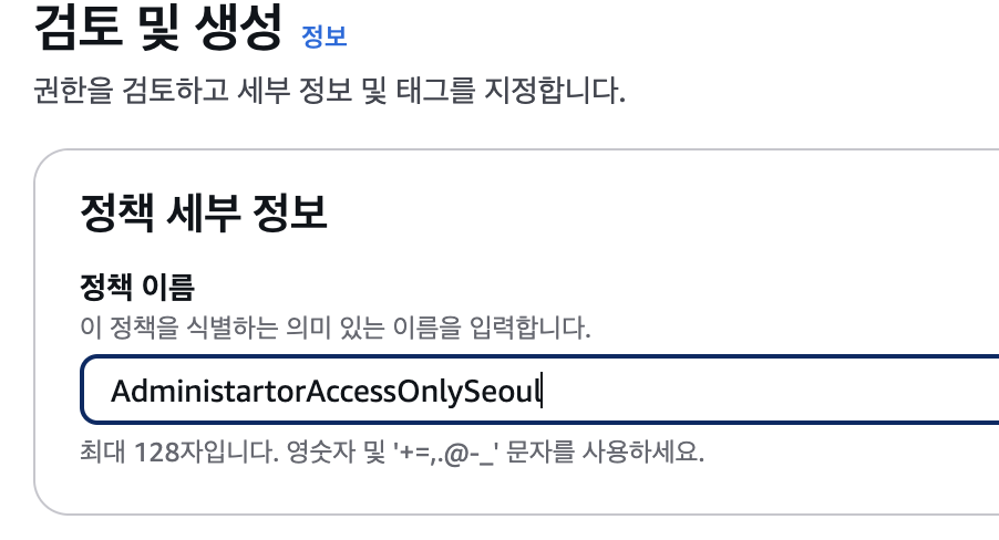 위 권한의 이름은 AdministratorAccessOnlySeoul 로 설정해주었다.