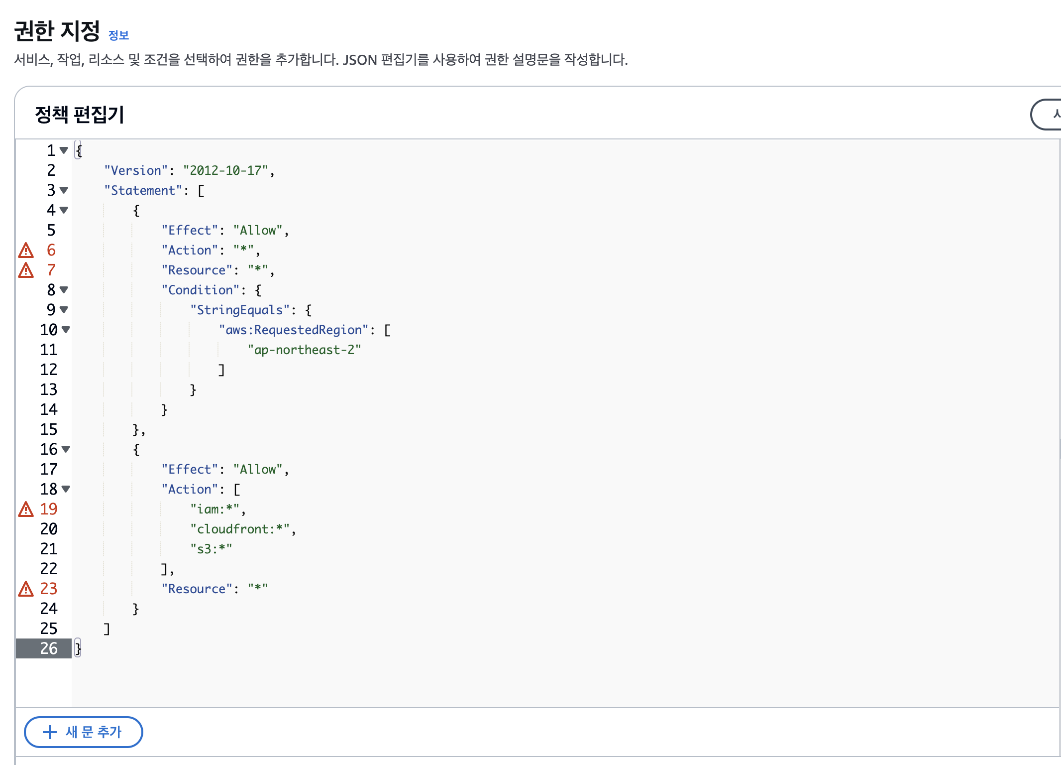 위 권한 설정 값은 AdministratorAccess 권한에 서울(ap-northeast-2) 리전 제한을 걸어둔 것이다.