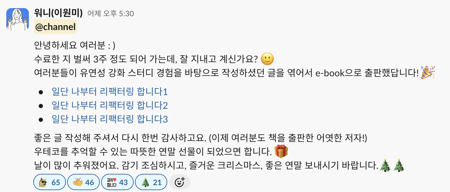 오늘 땅콩 팀원들과 연말파티를 보내고 있었는데 수료 후 잠잠하던 우테코 6기 슬랙에서 한 알림이 도착했다.