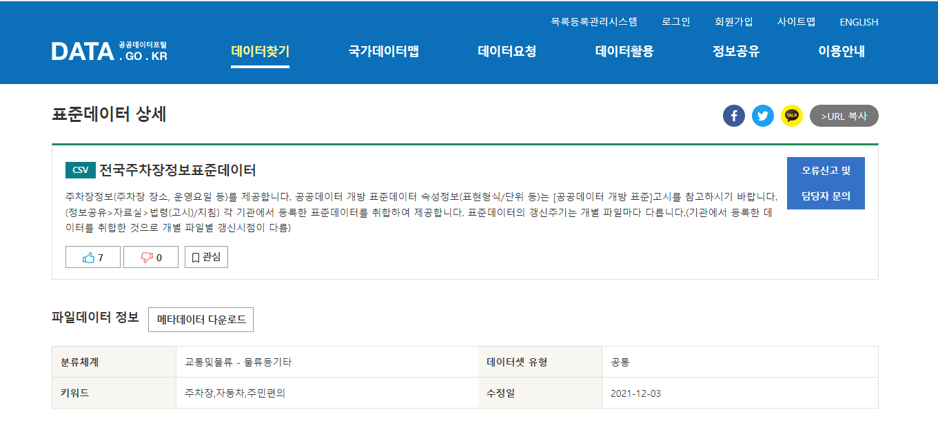 우리는 공공 데이터 포털에 접속하여 전국 주차장 정보 표준 데이터 를 찾았다.