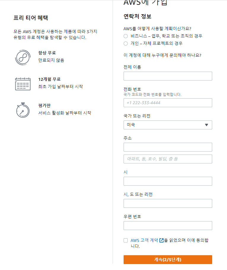 2단계 화면이다. 자신의 AWS 사용 용도를 선택하고 본인 개인정보를 입력해야한다.