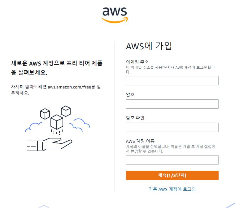 처음 나오는 화면은 이러하다. 여기서 이메일 주소와 암호 그리고 AWS에서 사용할 이름을 적고 '계속' 버튼을 눌러주자.