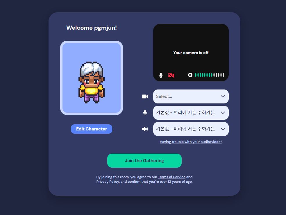 캐릭터 생성이 끝나면 방에 입장하기 전 마이크와 캠 설정 화면이 나옵니다.
