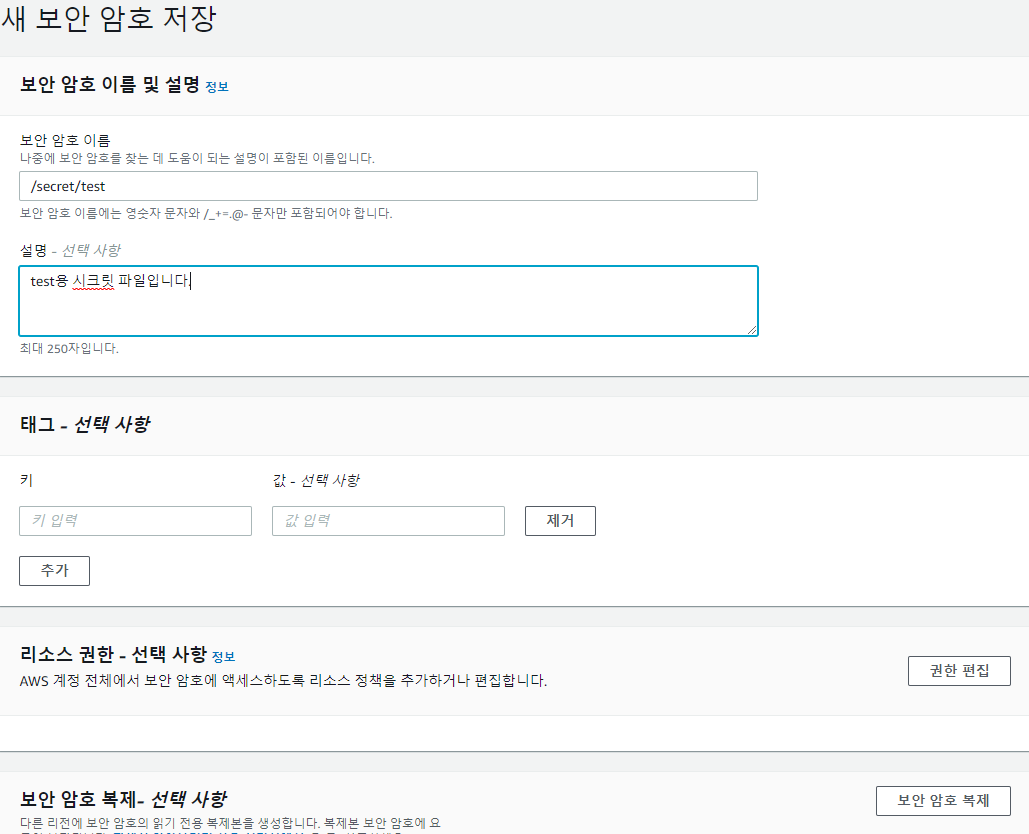 (시크릿매니저 이름)은 아까 생성한 "/secret/test"에서 test만 적어주는 형식으로 입력하면 된다.