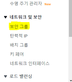 EC2 좌측 리스트의 "네트워크 및 보안 - 보안 그룹" 을 선택한다.