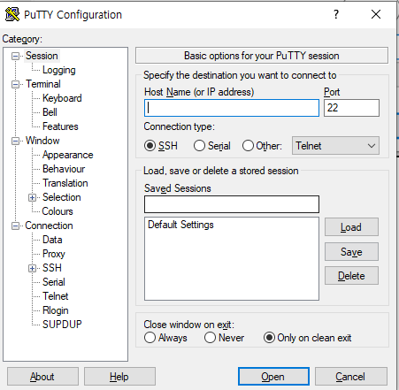 이제 PuTTY를 실행하면 IP address를 적는 곳이 있다.
