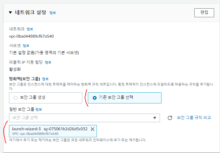 위처럼 만든 보안규칙은 EC2 생성시 보안규칙 설정에서 적용해준다.