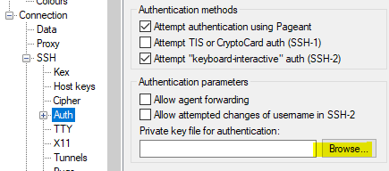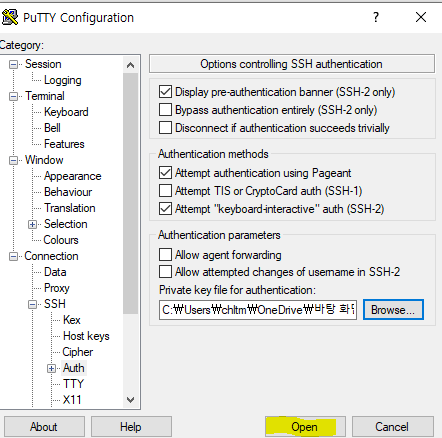SSH - Auth로 들어가 Browse 버튼을 클릭하여 ppk를 찾는다.