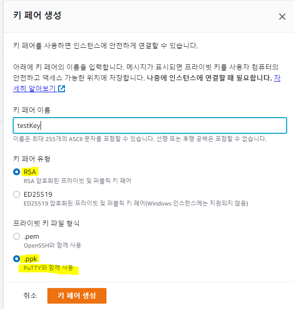 RSA / .ppk 형식을 선택 후 "키 페어 생성" 클릭.