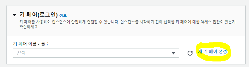 키 페어(로그인) 파트에서 "새 키 페어 생성" 을 선택한다.