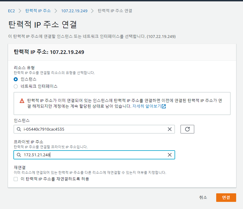 "탄력적 IP 주소 연결" 클릭.