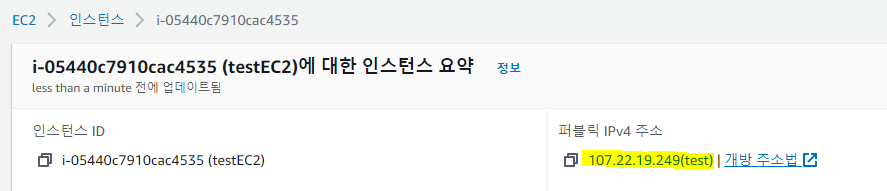 인스턴스에 퍼블릭 IPv4 주소가 탄력적 IP주소로 연결되었다.