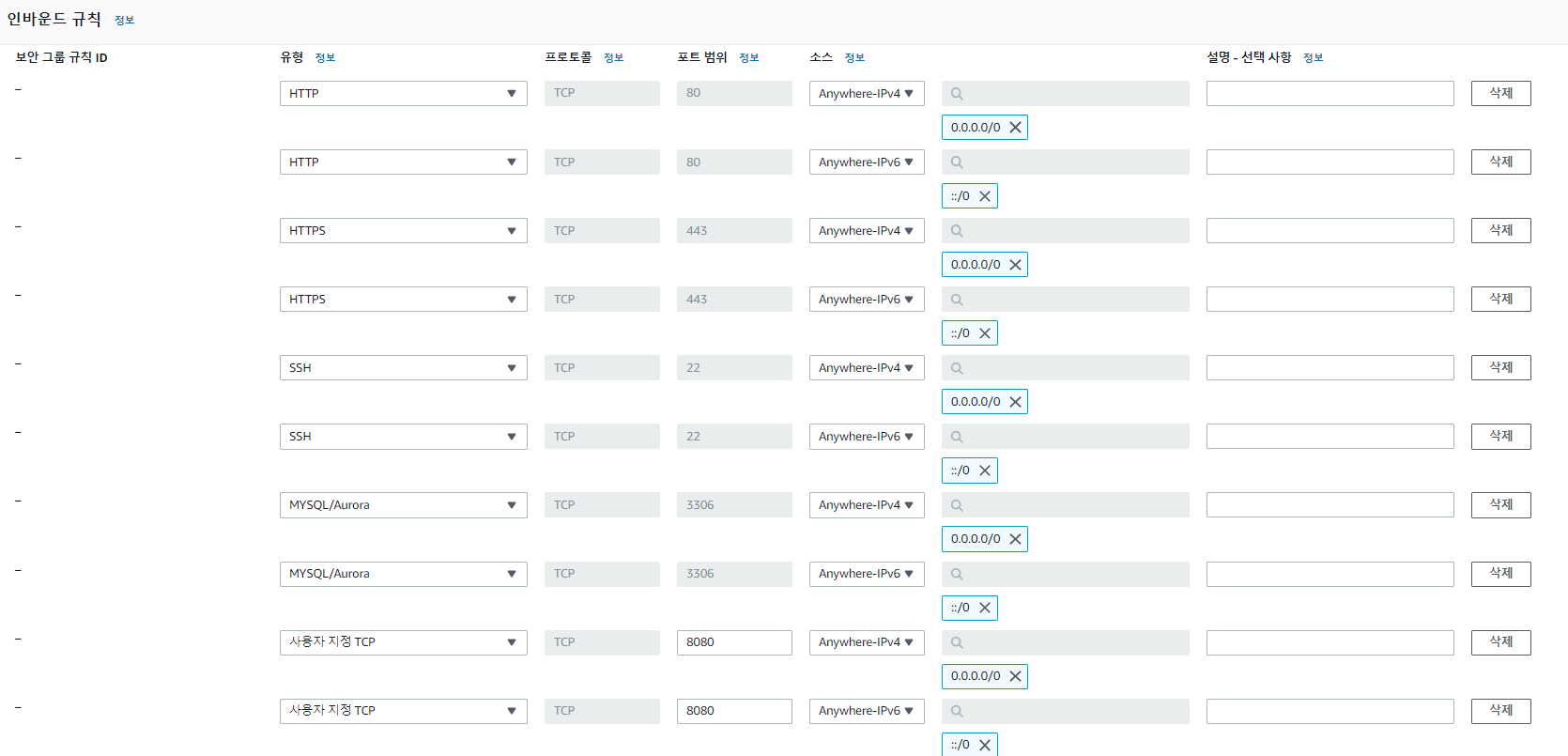 이번엔 접속과 연결을 위한 모든 인바운드 규칙을 설정해주겠다.