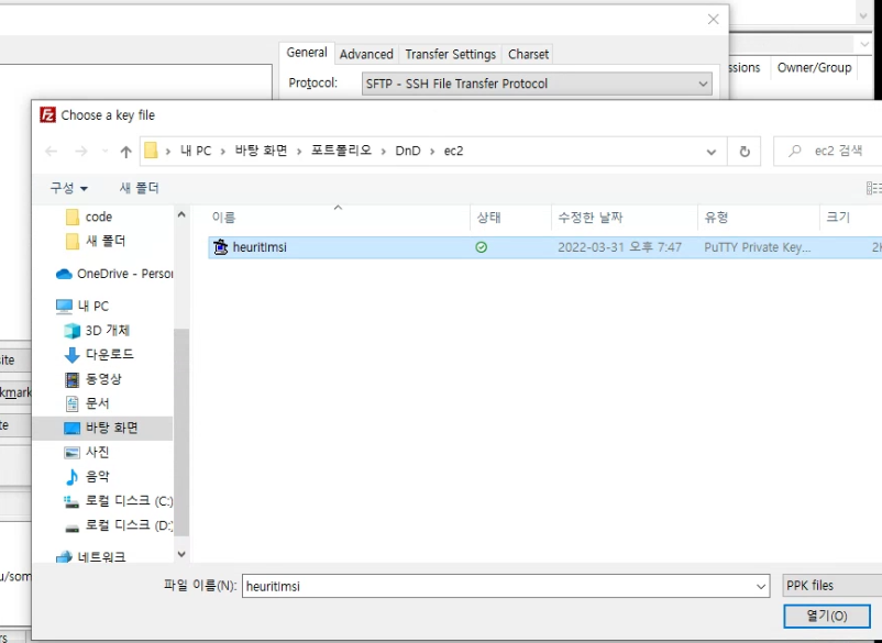 ppk파일을 선택 후 '열기'를 클릭한다.