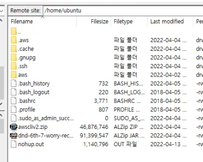 최종적으로 FTP 클라이언트인 파일질라를 사용하여 EC2 인스턴스에 접속한 것을 확인할 수 있다.