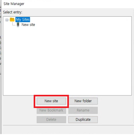 My Sites 폴더에 New site 를 클릭하여 site를 하나 만들어준다.