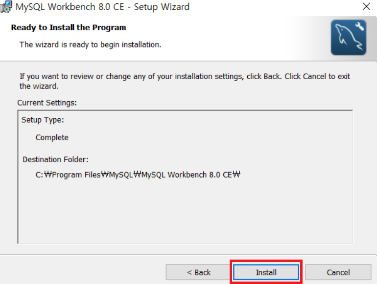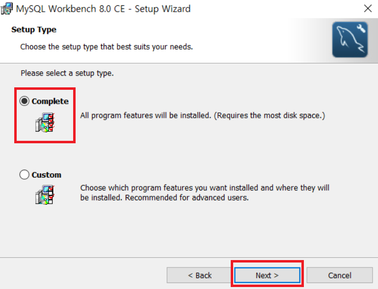 라디오 버튼을 Complete에 있도록 하고 Next를 누른다.