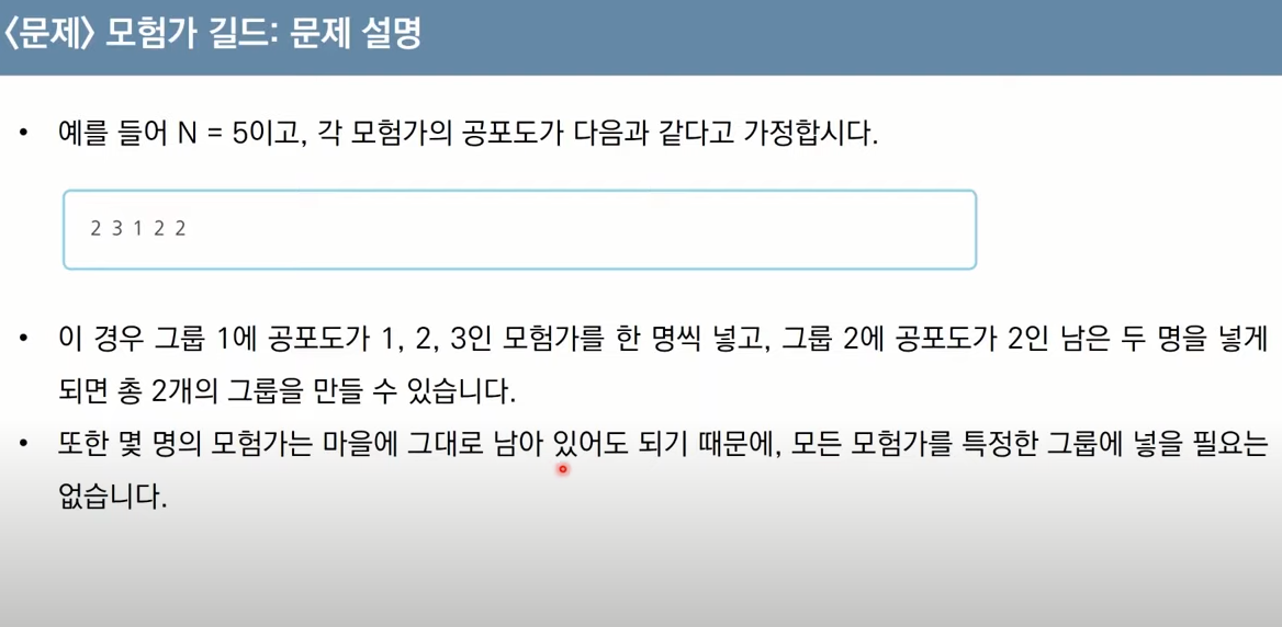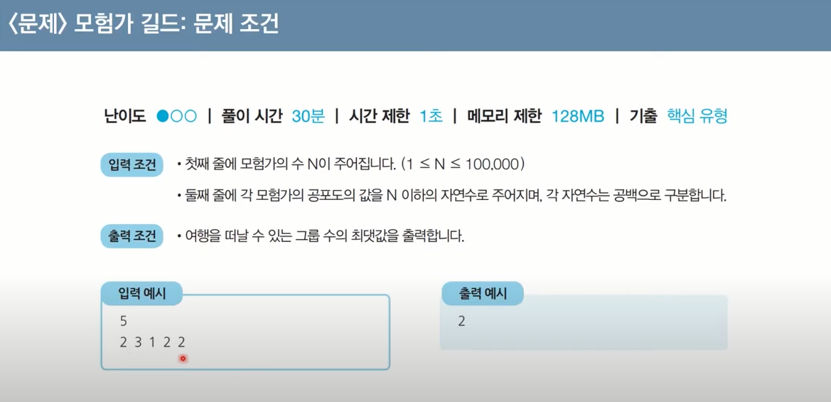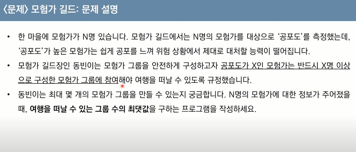 count = 0 #현재 그룹에 포함된 모험가의 수