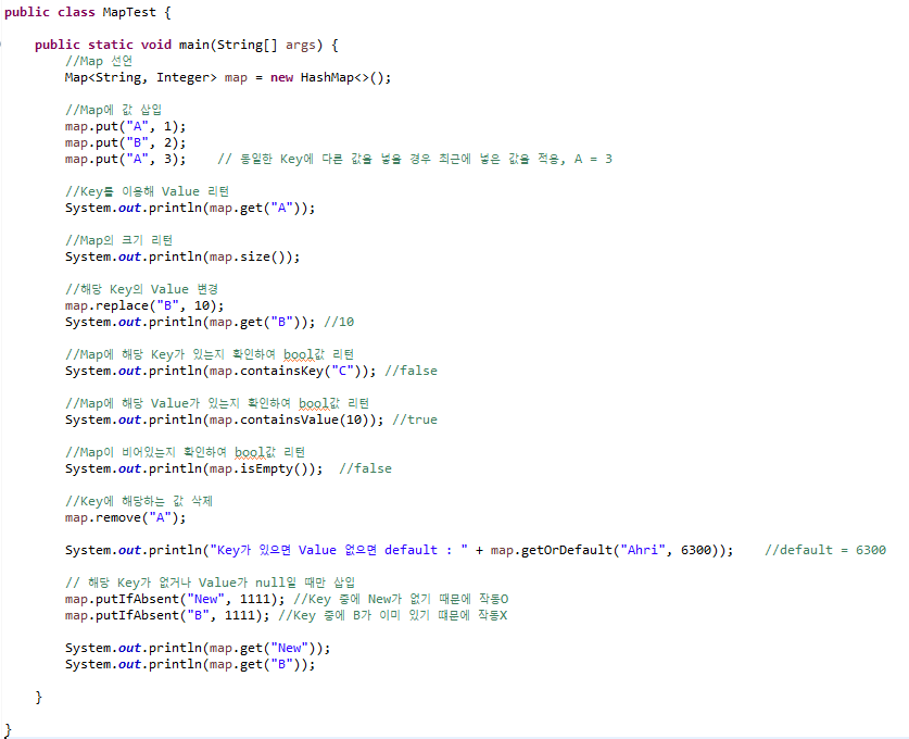 map.putIfAbsent("B", 1111); //Key 중에 B가 이미 있기 떄문에 작동X