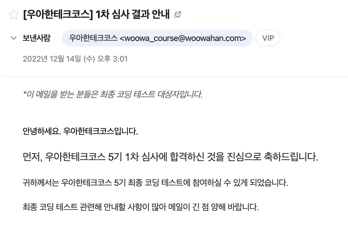 프리코스가 종료되고 얼마 후, 최종 코딩테스트를 보러갈 권한을 얻었다는 메일을 받게 되었다.