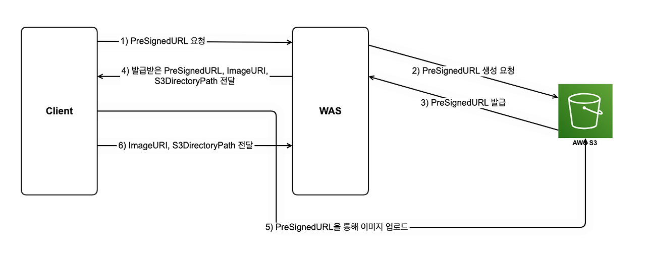 ํด๋ผ์ด์ธํธ๋ ์ด๋ฏธ์ง๋ฅผ ์ ๋ก๋ ํ ImageURI์ S3DirectoryPath๋ฅผ WAS์๊ฒ ์ ๋ฌํ๋ค.