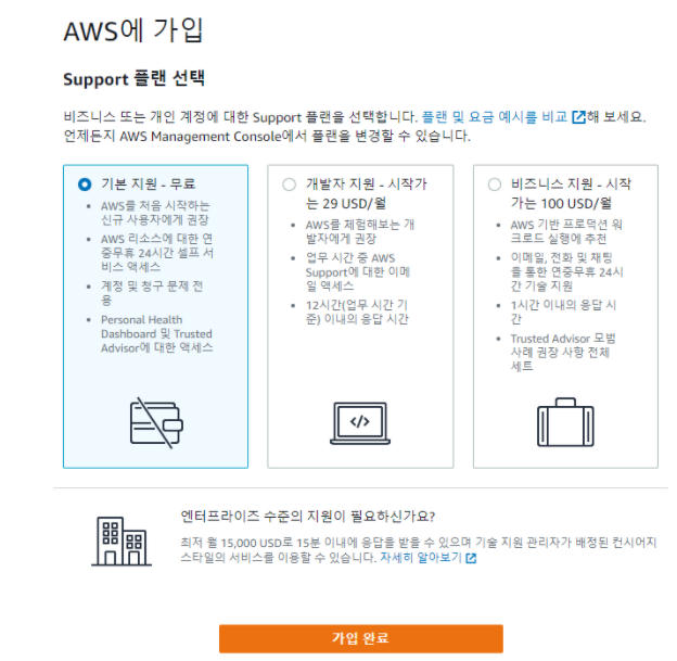 우리는 프리 티어를 사용하기 위해 가입하는 것이므로 '기본 지원 - 무료' 를 선택해주면 된다.