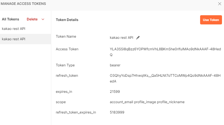 설정이 끝나면 하단에 있는 Get New Access Token 을 클릭하여 카카오 로그인을 하여 토큰을 받을 수 있다.